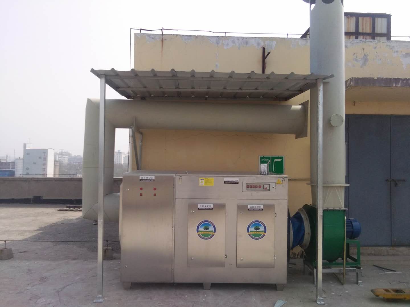 設(shè)備分別由離子凈化區(qū)、光氧催化區(qū)、隔離吸附區(qū)三部分組成的一體機